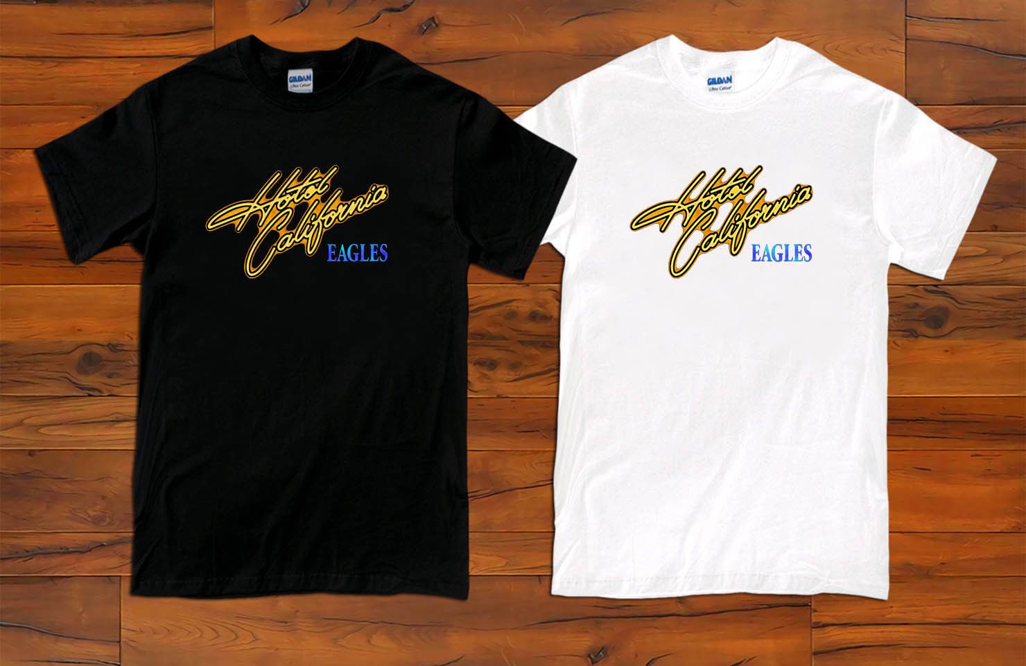 Eagles hotel california t shirt. Available in limited quantities while supplies last. Black t shirt features cover art of the eagles landmark album hotel california on front. The back of the t shirt is blank and does not include tour dates or cities.
