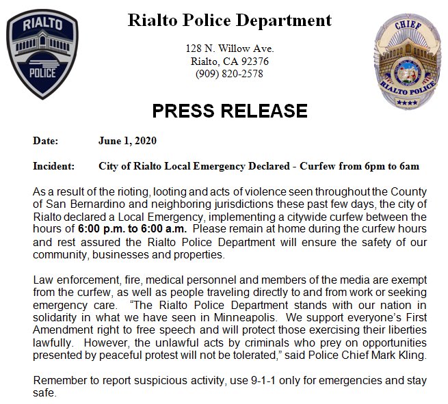 Costa Mesa Has Issued A Citywide Curfew Beginning Tonight At 7 P M